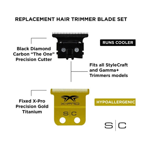 StyleCraft Fixed X-PRO Gold Titanium Replacement Trimmer Blade w/ Black Diamond Carbon DLC Deep Tooth Cutter Set